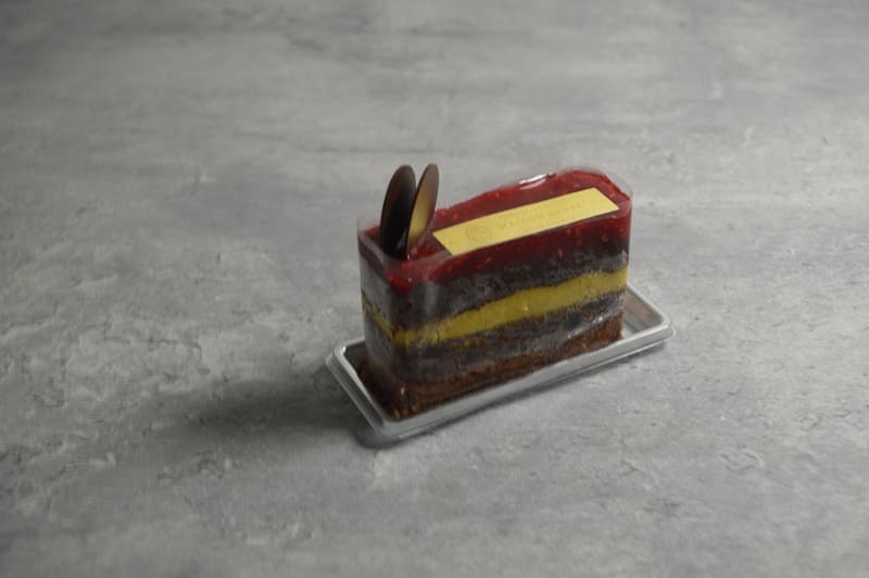 ラズベリー、チョコレート、ピスタチオを組み合わせたムースケーキ